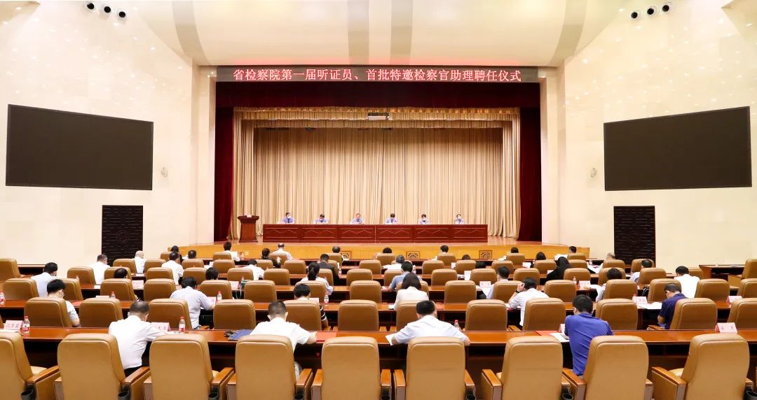 为认真贯彻落实《中共中央关于加强新时代检察机关法律监督工作的意见》和最高检关于全面深入开展检察听证和特邀检察官助理工作的部署要求,充分借助“外脑”提升办案质效,助推检察工作高质量发展,8月16日上午,省检察院举行第一届听证员、首批特邀检察官助理聘任仪式,共选聘40名听证员、27名特邀检察官助理。省检察院党组副书记、副检察长张振忠同志出席会议并讲话,党组副书记、副检察长宋文娟同志主持会议,党组成员、政治部主任刘建军同志宣读聘任决定。