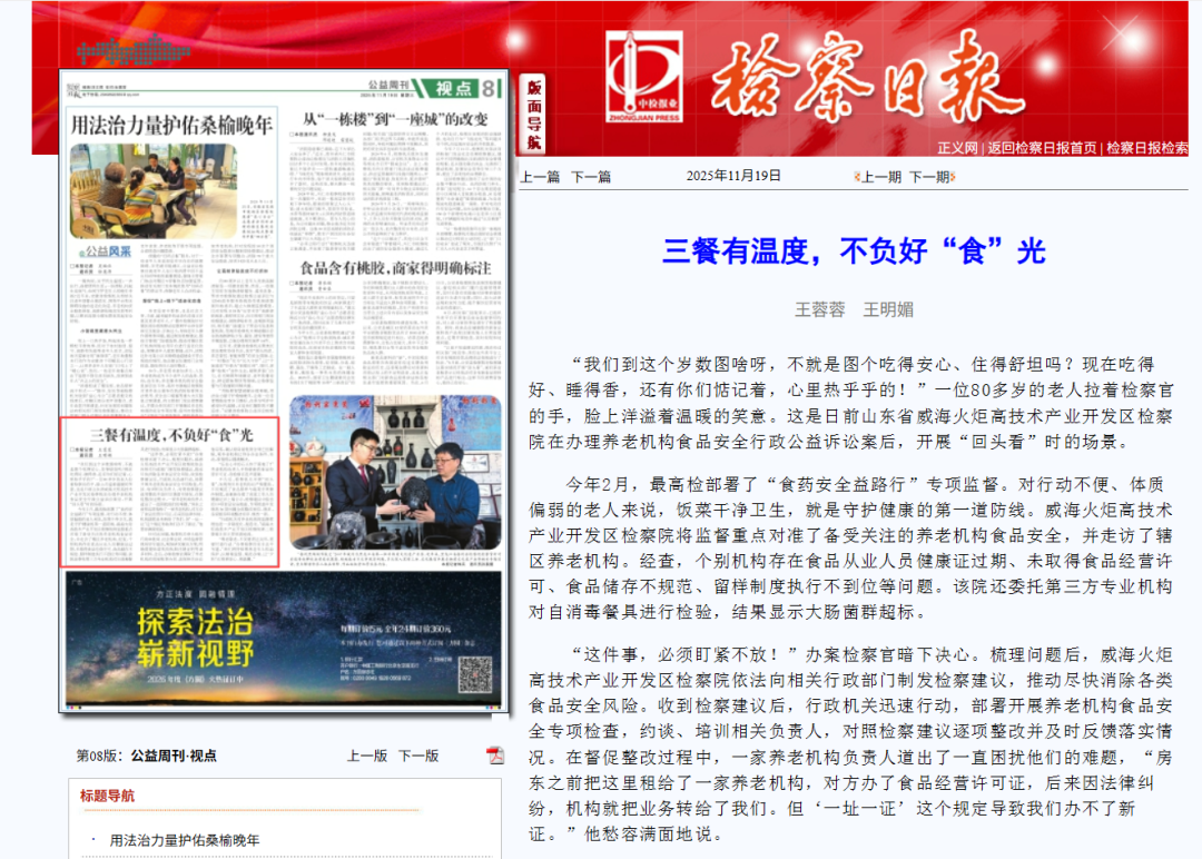 “我们到这个岁数图啥呀,不就是图个吃得安心、住得舒坦吗?现在吃得好、睡得香,还有你们惦记着,心里热乎乎的!”一位80多岁的老人拉着检察官的手,脸上洋溢着温暖的笑意。这是日前山东省威海火炬高技术产业开发区检察院在办理养老机构食品安全行政公益诉讼案后,开展“回头看”时的场景。今年2月,最高检部署了“食药安全益路行”专项监督。对行动不便、体质偏弱的老人来说,饭菜干净卫生,就是守护健康的第一道防线。威海火炬高技术产业开发区检察院将监督重点对准了备受关注的养老机构食品安全,并走访了辖区养老机构。经查,个别机构存在食品从业人员健康证过期、未取得食品经营许可、食品储存不规范、留样制度执行不到位等问题。该院还委托第三方专业机构对自消毒餐具进行检验,结果显示大肠菌群超标。“这件事,必须盯紧不放!”办案检察官暗下决心。梳理问题后,威海火炬高技术产业开发区检察院依法向相关行政部门制发检察建议,推动尽快消除各类食品安全风险。收到检察建议后,行政机关迅速行动,部署开展养老机构食品安全专项检查,约谈、培训相关负责人,对照检察建议逐项整改并及时反馈落实情况。在督促整改过程中,一家养老机构负责人道出了一直困扰他们的难题,“房东之前把这里租给了一家养老机构,对方办了食品经营许可证,后来因法律纠纷,机构就把业务转给了我们。但‘一址一证’这个规定导致我们办不了新证。”他愁容满面地说。针对此问题,检察机关牵头组织行政审批局、社会事业局、市场监督管理局举行座谈,现场研究解决方案,明确需提供原机构执照注销证明等诸多材料。会后,办案检察官调取了养老机构的房屋租赁合同、法院相关诉讼卷宗等,确认原房屋租赁合同已经解除,现养老机构已符合办证条件。至此,事情得以圆满解决。“压在心中的石头终于落地了!”养老机构负责人手持崭新的食品经营许可证,向检察官连声道谢。不久后,检察机关开展“回头看”,发现相关养老机构已严格整改,不仅规范了食品留样与蔬菜分类储存制度,还重新办理了食堂工作人员健康证并上墙公示,检察建议中指出的19项食品安全隐患、专项检查中发现的36项问题全部整改到位。现在,各家厨房环境整洁有序、焕然一新。“行政机关对养老机构的监督管理也进一步制度化、规范化。”威海火炬高技术产业开发区检察院第二检察部主任王萍欣喜地说。“尊老敬老,不仅要表达关怀,更要付诸行动。”办案检察官在日志中写道,“我们将持续聚焦老年人权益保护,以精准监督、规范办案,让‘夕阳’红得更安心、更温馨。”