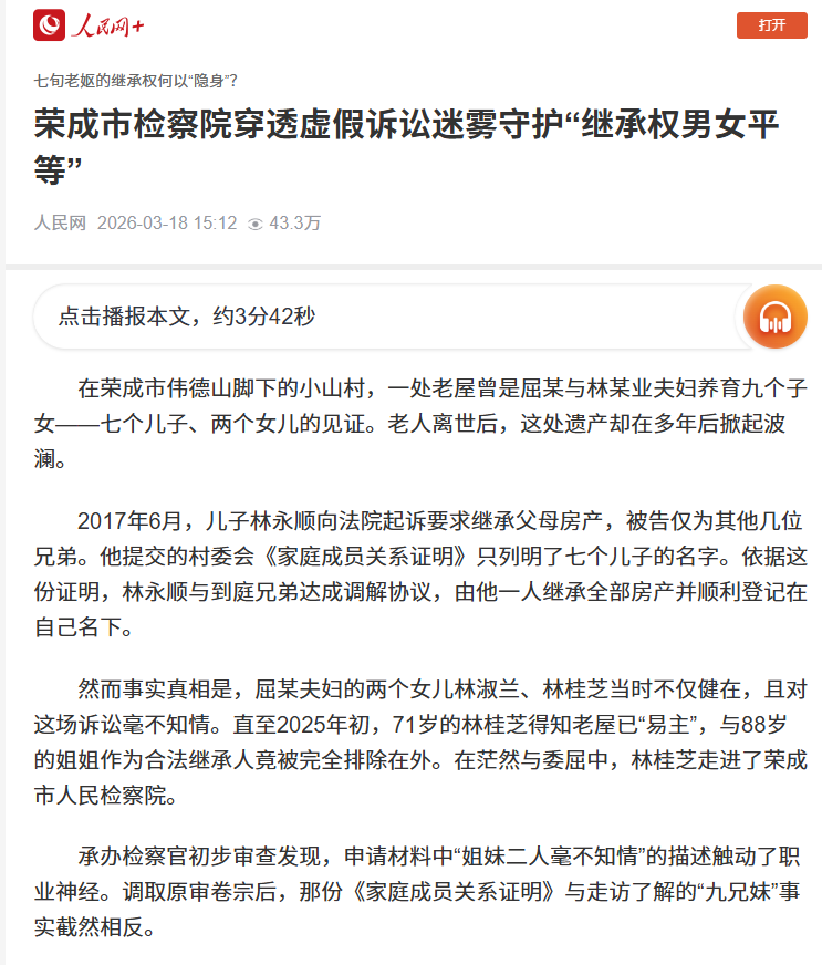 承办检察官指出:“林永顺在诉讼中故意隐瞒其他继承人健在的事实,并提供虚假证明,违背民事诉讼诚实信用基本原则,涉嫌虚假诉讼。案件中折射出的‘儿承家业’旧俗观念与《民法典》规定的‘继承权男女平等’原则完全相悖。”